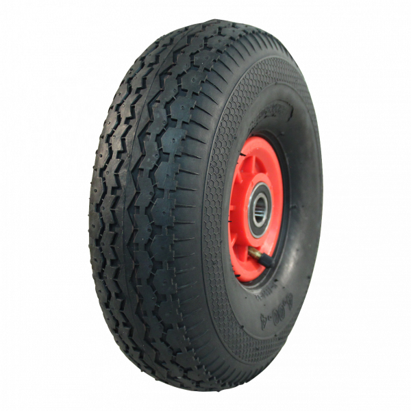 Dies ist ein loses Rad aus Kunststoff. Die Felge besteht aus Kunststoff (Farbe rot) und die Lauffläche aus Luftreifen (schwarz Farbe). Das Rad hat einen Durchmesser von 270 millimeter und eine Breite von 90 millimeter. Die Nabenlänge beträgt 75 millimeter und die Achsbohrung hat einen Durchmesser von 20 millimeter. Die Tragfähigkeit beträgt 160 kg. Das Rad hat ein Kugellager als Lagerung.