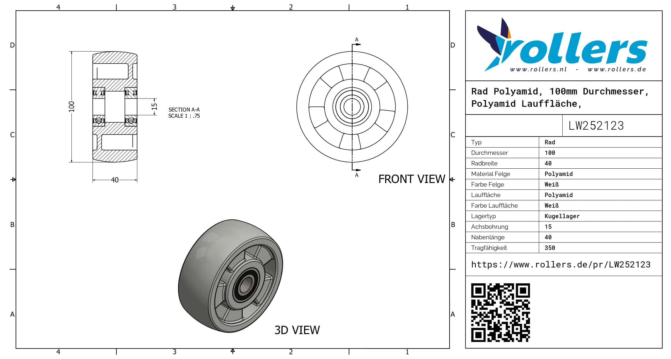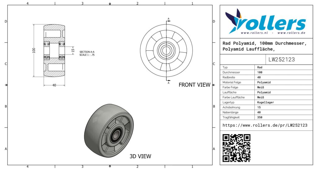 Dies ist ein loses Rad des Materials Polyamid. Die Felge besteht aus Polyamid (Farbe weiß) und die Lauffläche aus Polyamid (weiß). Das Rad hat einen Durchmesser von 100 millimeter und eine Breite von 40 millimeter. Die Nabenlänge beträgt 40 millimeter mit einem Achsloch von 15 millimeter. Die Rad hat eine Tragfähigkeit von 350 kilogram. Das Rad hat ein Kugellager als Lagerung. Dieses Produkt finden Sie in unseren Kategorien: Kunststoffräder, Räder mit Lager, Räder 100 mm, Räder 300 kg, Schwerlastrollen, Transportrollen, Nylon Rollen, Nylon Rollen mit Lager, Räder.