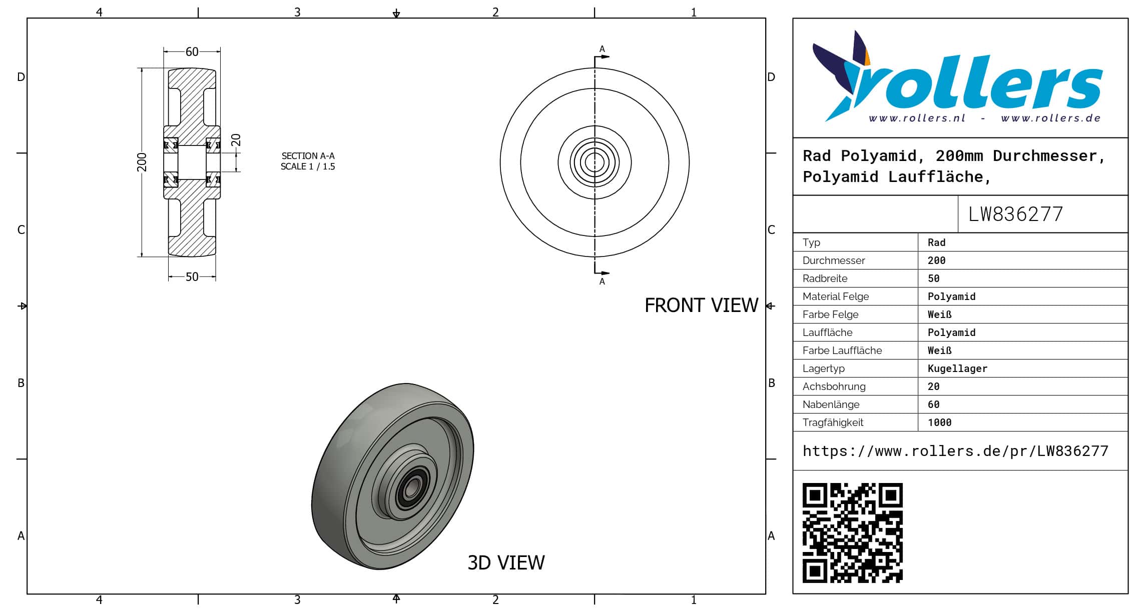 Dies ist ein loses Rad aus Polyamid. Das Material der Felge ist Polyamid (weiß ist die Farbe) und der Lauffläche Polyamid (Farbe weiß). Das Rad hat einen Durchmesser von 200 mm und eine Breite von 50 mm. Die Nabenlänge beträgt 60 mm und die Achsbohrung hat einen Durchmesser von 20 mm. Die Tragfähigkeit beträgt 1000 kilo. Das Rad hat ein Kugellager als Lagerung. Dieses Produkt ist in unserem Shop in folgenden Kategorien erhältlich: Kunststoffräder, Räder mit Lager, Räder 1000 kg, Räder 200 mm, Schwerlastrollen, Transportrollen, Nylon Rollen, Nylon Rollen mit Lager, Räder.
