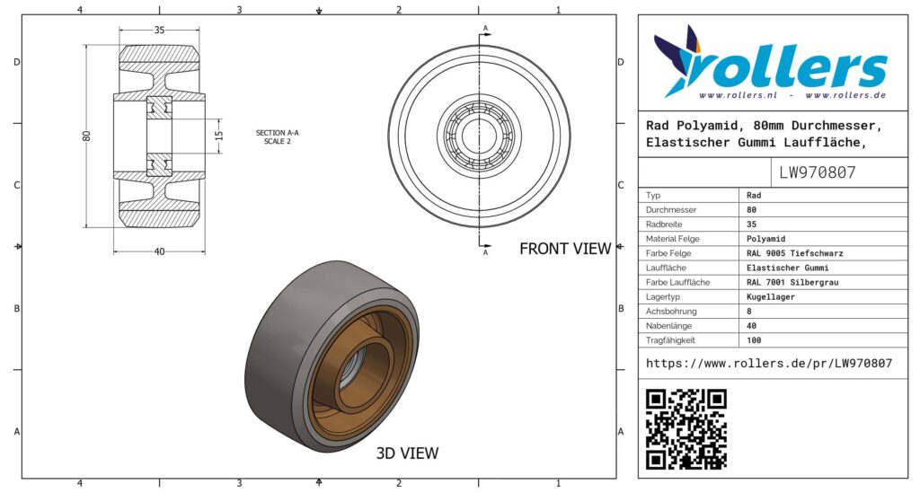 Dies ist ein loses Rad aus Polyamid. Das Material der Felge ist Polyamid (Farbe RAL 9005 Tiefschwarz) und der Lauffläche Elastischer Gummi (Farbe RAL 7001 Silbergrau). Das Rad hat einen Durchmesser von 80 millimeter und eine Breite von 35 millimeter. Die Nabenlänge beträgt 40 millimeter und die Achsbohrung hat einen Durchmesser von 8 millimeter. Das Rad hat eine Tragfähigkeit von 100 kg. Das Rad hat ein Kugellager als Lagerung. Dieses Produkt ist in unserem Shop in folgenden Kategorien erhältlich: Kleine Räder, Kleine Räder mit Lager, Räder mit Lager, Gummiräder, Müllcontainer Rollen, Räder 80 mm, Räder 100 kg, Transportrollen, Räder.