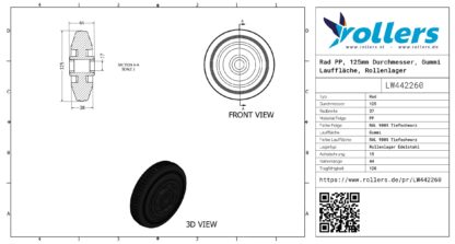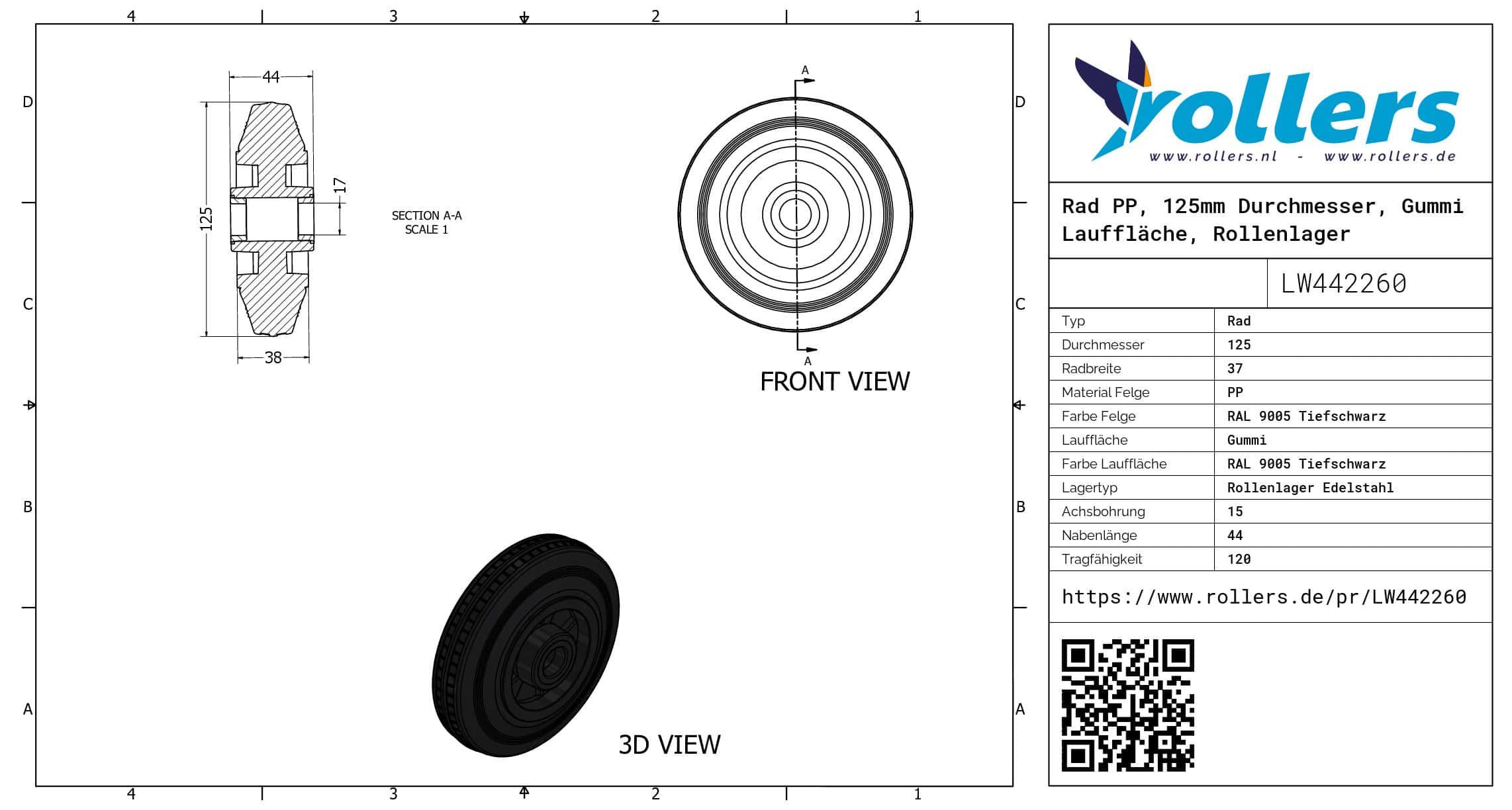 Dies ist ein loses Rad aus PP. Die Felge besteht aus PP (RAL 9005 Tiefschwarz) und die Lauffläche aus Gummi (RAL 9005 Tiefschwarz ist die Farbe). Das Rad hat einen Durchmesser von 125 mm und eine Breite von 37 mm. Die Nabenlänge beträgt 44 mm mit einem Achsloch von 15 mm. Die Rad hat eine Tragfähigkeit von 120 kilo. Das Rad hat ein Rollenlager Edelstahl als Lagerung. Rollers.de hat dieses Produkt in die folgenden Kategorien eingeteilt: Räder mit Lager, Gummiräder, Rostfreie Räder, Müllcontainer Rollen, Räder 100 kg, Räder 125 mm, Transportrollen, Räder.