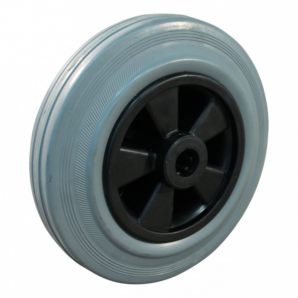 Dies ist ein loses Rad des Materials PP. Das Material der Felge ist PP (Farbe RAL 9005 Tiefschwarz) und der Lauffläche Gummi (Farbe RAL 7001 Silbergrau). Das Rad hat einen Durchmesser von 160 millimeter und eine Breite von 40 millimeter. Die Nabenlänge beträgt 58 millimeter mit einem Achsloch von 20 millimeter. Das Rad hat eine Tragfähigkeit von 140 kg. Das Rad hat ein Rollenlager als Lagerung. Marke: Novio.