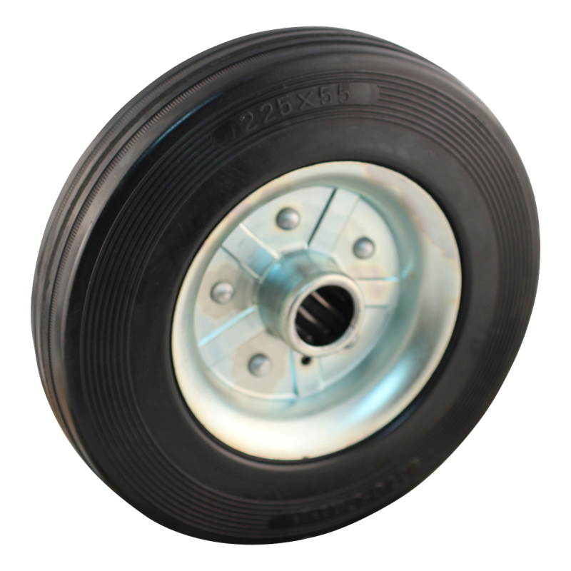 Dies ist ein loses Rad aus Stahl. Das Material der Felge ist Stahl (Verzinkt ist die Farbe) und der Lauffläche Gummi (schwarz). Das Rad hat einen Durchmesser von 225 mm und eine Breite von 55 mm. Die Nabenlänge beträgt 55 mm mit einem Achsloch von 25 mm. Die Tragfähigkeit beträgt 300 kg. Das Rad hat ein Rollenlager als Lagerung.