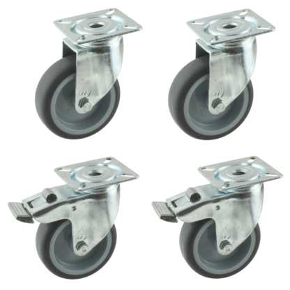 Rollensatz 4x Lenkrolle Stahl (2x mit Bremse 2x ohne), 75mm Durchmesser, TPE Lauffläche