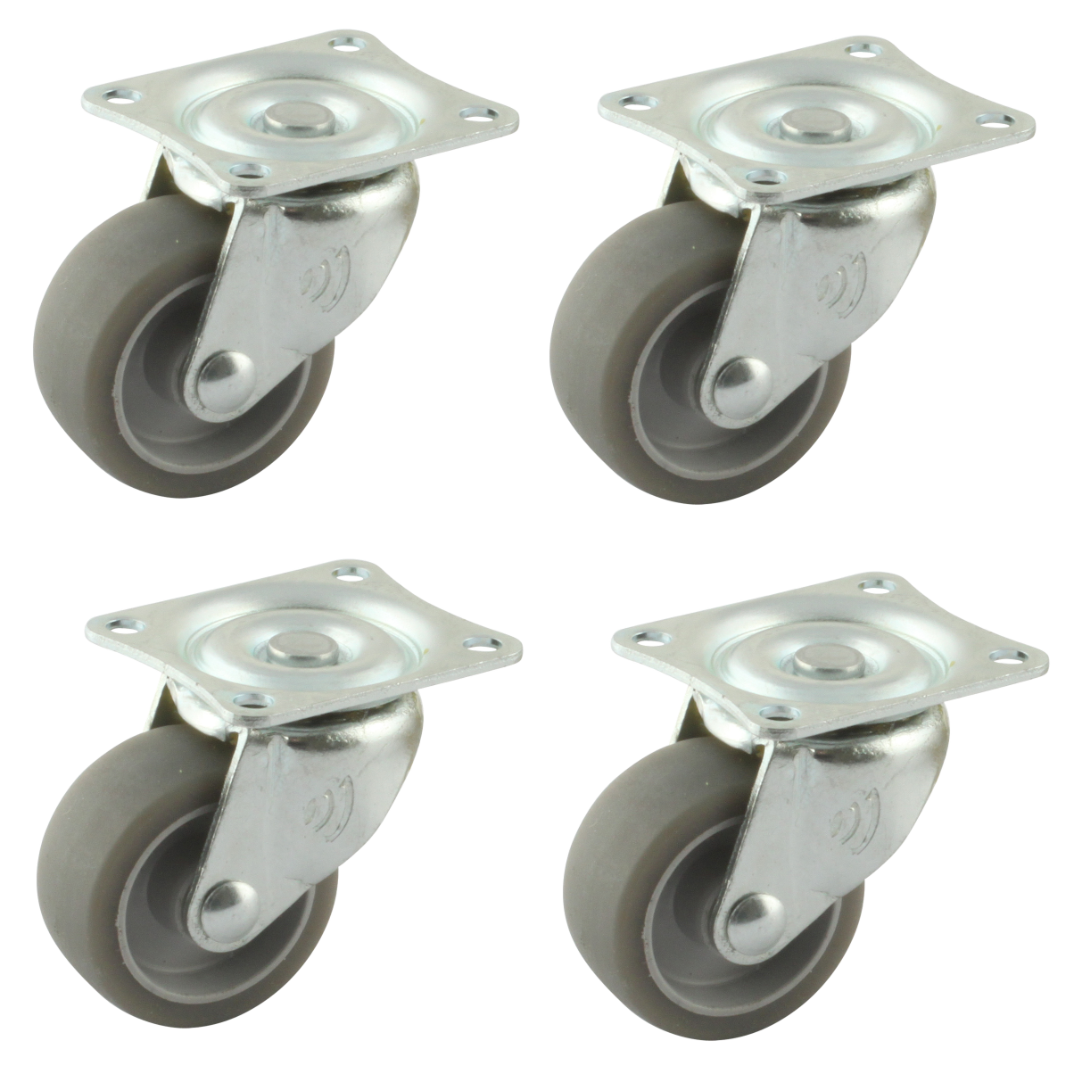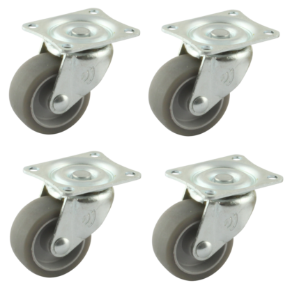 Dieser Rollensatz besteht aus 4 Lenkrollen mit einer Stahlgabel. Eine Lenkrolle kann mit Befestigingsart „Platte“ befestigt werden. Die Bauhöhe ist 42 millimeter. Das Material der Felge ist PP (RAL 7001 Silbergrau ist die Farbe) und der Lauffläche TPE (Farbe RAL 7015 Schiefergrau). Das Rad hat einen Durchmesser von 32 millimeter und eine Breite von 14 millimeter. Die Lenkrolle hat eine Tragfähigkeit von 20 kilo.